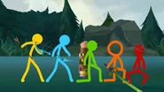 After their victory, the Stick Gang celebrate, tossing The Second Coming into the air like a cheerleader, hugging, and high-fiving. That is, until Yellow notices Purple sulking in the corner, mourning his defeat. After a moment, The Second Coming approaches Purple, who is taken aback and possibly fearing what the Gang will do to him. But The Second Coming offers him his hand, and the two shake hands and hug. He offers Purple his spot with the Fighting Stick Figures, who greet him and welcome him to the group. The Second Coming gives Red the signal and Red starts up another game, but this time, The Second Coming decided to make clones (as Draven, Talon, Teemo, Diana, Leona) for the Fighting Stick Figures and Purple to fight. The Second Coming's clones all draw their weapons, ready to rumble, and the Fighting Stick Figures charge into battle, except for Green, who pauses and urges Purple to join them before following his friends. After a moment, Purple raises his sword high above his head and charges into battle as well.