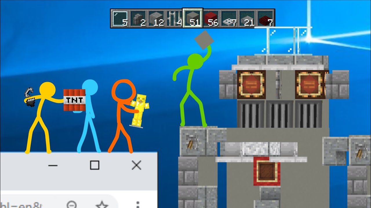 The episode begins with The Second Coming using the Minecraft Game Icon block to create four stacks of every item. The Fighting Stick Figures each take a stack of every item. The Second Coming then puts away Minecraft, and opens Google Chrome.