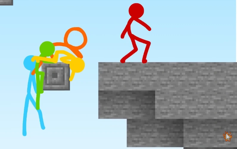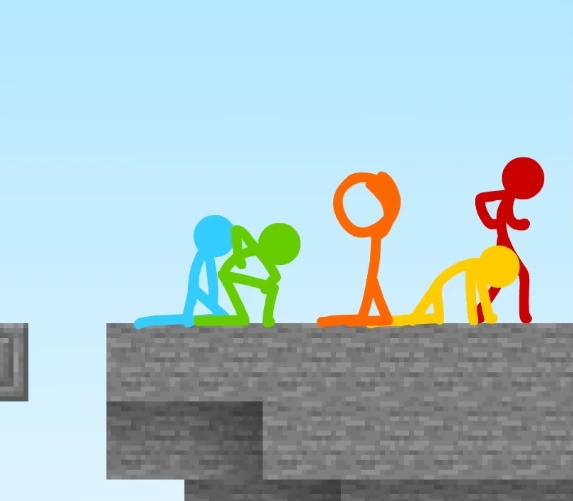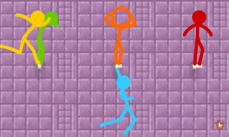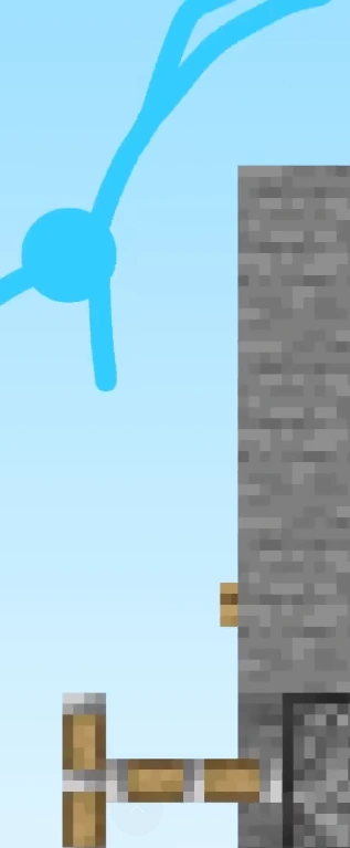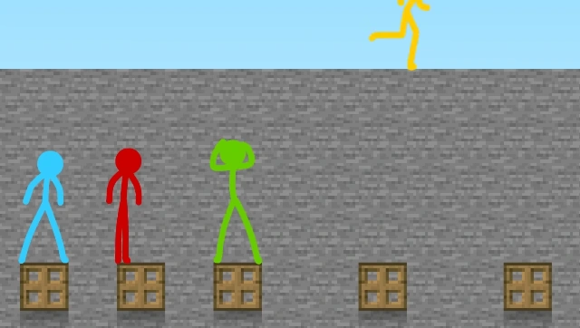 When they enter the final parkour course, Purple does something different: he lets the stick figures go one at a time around every five seconds. At a certain point of the parkour course, every time one of the stick figures take a path, the path automatically switches to another path, and the next stick figure has no idea the path has been switched.