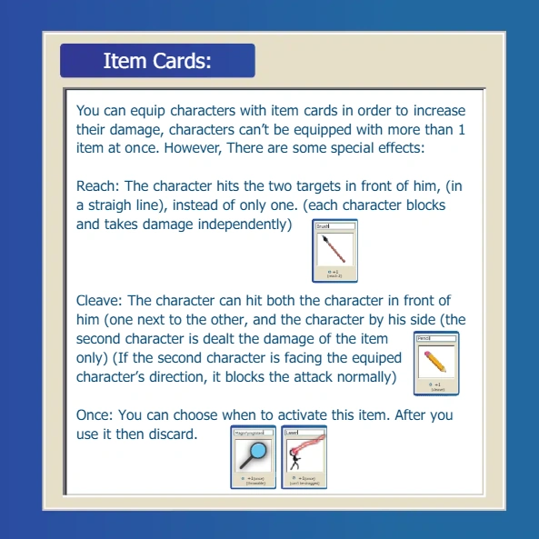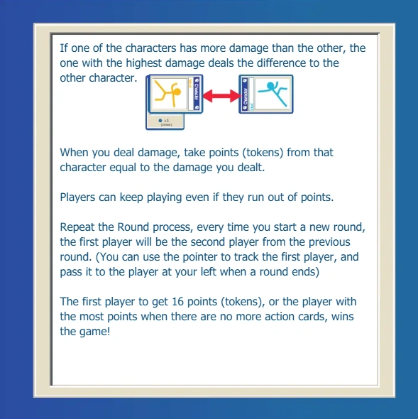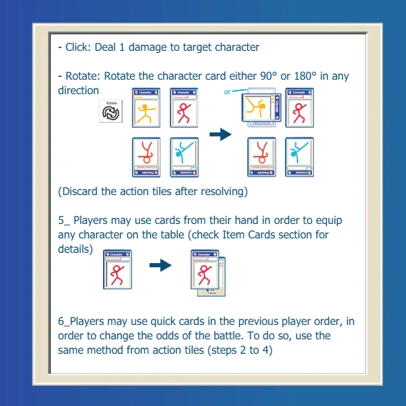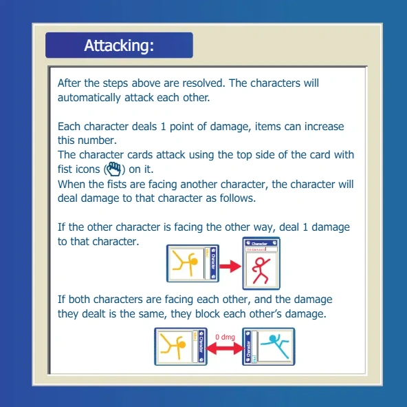 The quick cards are revealed and used. Then the fists indicate where each character is attacking. They take their damage dealt amount of tokens from the player their character is facing (e.g. blue faces green with no item, so blue takes one of green's tokens) More to be added...