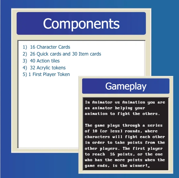 Animator vs Animation, The Official Card Game is a card game based on the Animator vs. Animation Series, where you are an animator and use skills like move, drag, rotate and other in order to equip and direct your animation to attack others and get points.