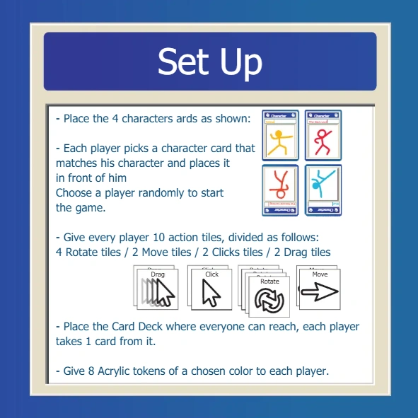 Setup the cards, usually in a 2x2 grid with the fists on the character cards facing away from the other characters. Each player starts with 8 tokens.