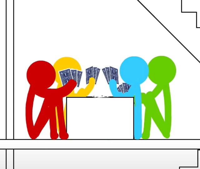 However, Green respawns on sticksfight.com and heads back out to the desktop to see what is going on. There, he sees his friends holding a funeral for him and decides to scare them by jumping out as they are paying respects. However, this scares Blue and TSC too well, as they pull out their swords and kill Green again before realizing again what they had done. However, Green simply respawned again off-screen.