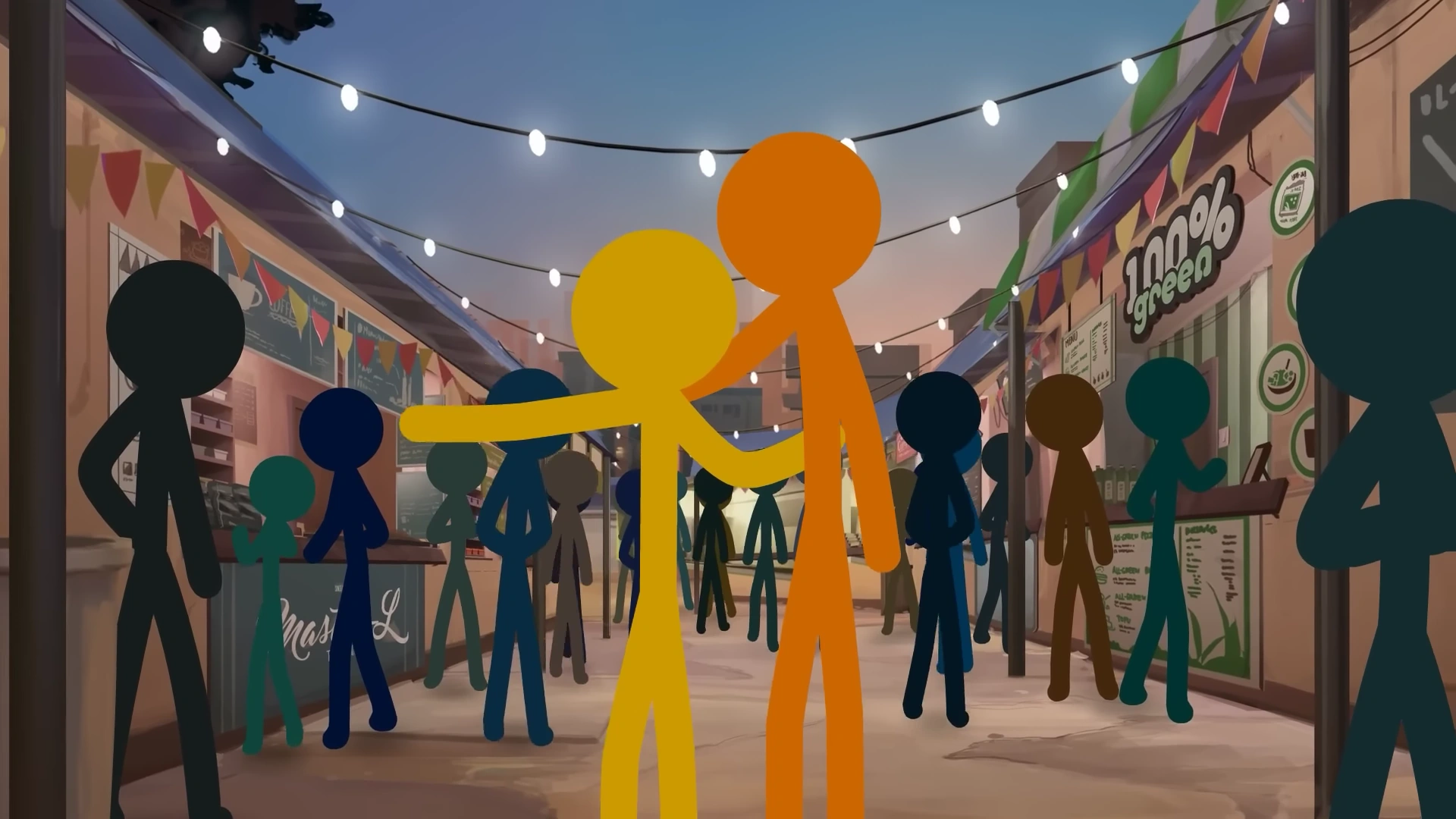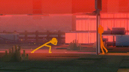 The stick figures attempt to battle on their own, but are subdued by the energy beam King Orange directs at them, which causes them to glitch and flicker. Purple decides to stand up to his former leader as he simply walks forward while King Orange directs the beam at him, slowly dissolving his body. Suddenly, King Orange has a flashback, viewing Purple as Gold, and drops his staff, rushing in to save Purple, as the two vanish in the beam.