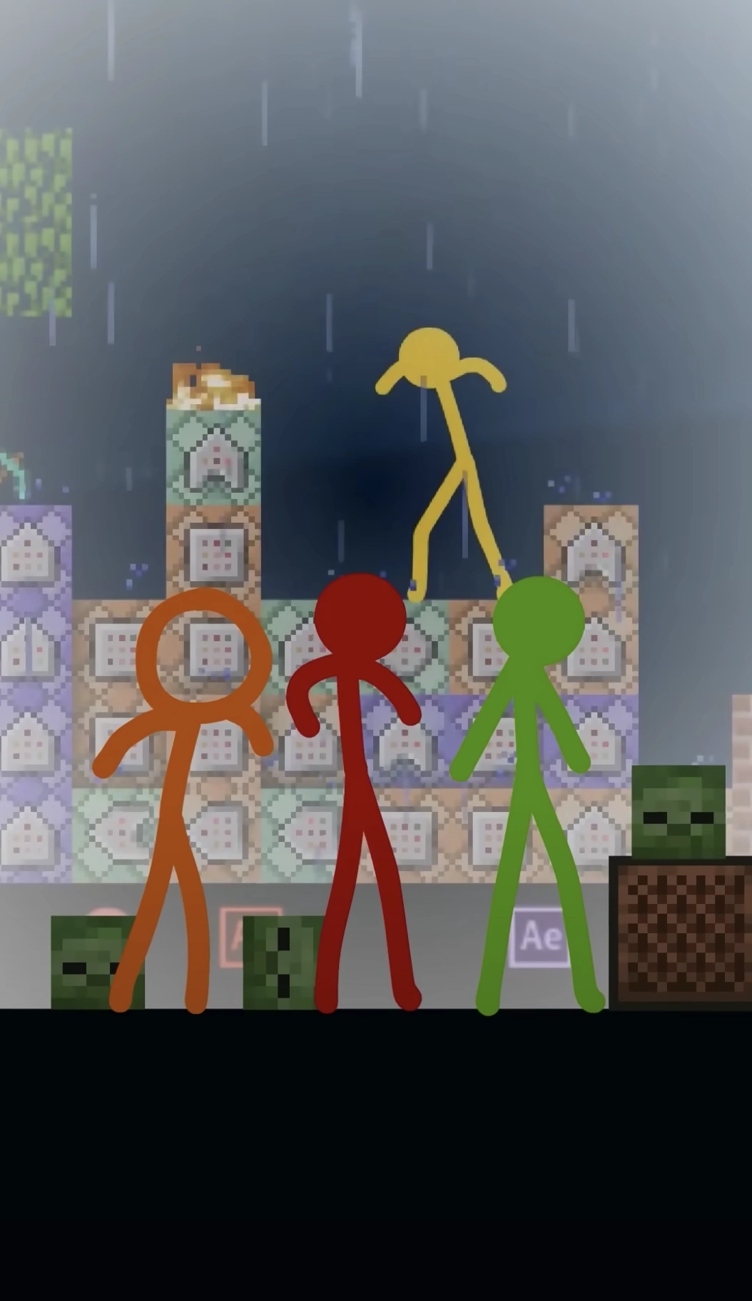 - The stick figures are 3.5 blocks tall instead of 2.5 blocks. This is easily noticable when Green punches the tree.