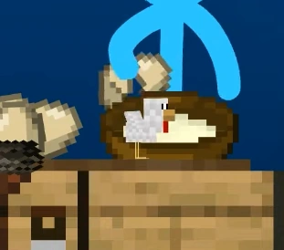 A chicken is held by Red as a reference for a build, and when Blue accidentally makes a noise with a note block, it runs away.