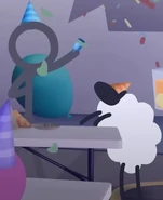 The sheep also shows up during the montage while one of the town folk is explaining the Outernet. Then, it's seen looking at the sweet moment of victim and Mitsi cuddling and looking up at Agent as Agent shushes it. Years later, the sheep is seen during the anniversary party with an orange party hat and has some sick dance moves. It sees victim's awkward dance moves and is perplexed by it, and continues to dance until the tragic Newgrounds event happened. Thankfully, the sheep's file was not destroyed as it did not get teleported back to Newgrounds, but their owner was not so lucky and perished. When Agent makes his way back to Rocket Corp., the sheep can be seen realizing Mitsi did not make it and grieving her loss with a sad bleat.
