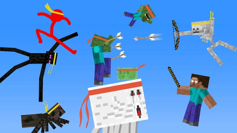 The next obstacle was five Steve clones armed with iron swords and each had a pair of Elytra to harden the difficulty. Seeing this, Endie pushes Skellington out, and motions for him to shoot down the clones. Skellington nods, as he pulls his bow and shoots multiple arrows, they all miss, before Red tapped Skellington on his shoulder, and turned his bow backwards while he wasn't looking. This time, the Skellington finally hit a shot.