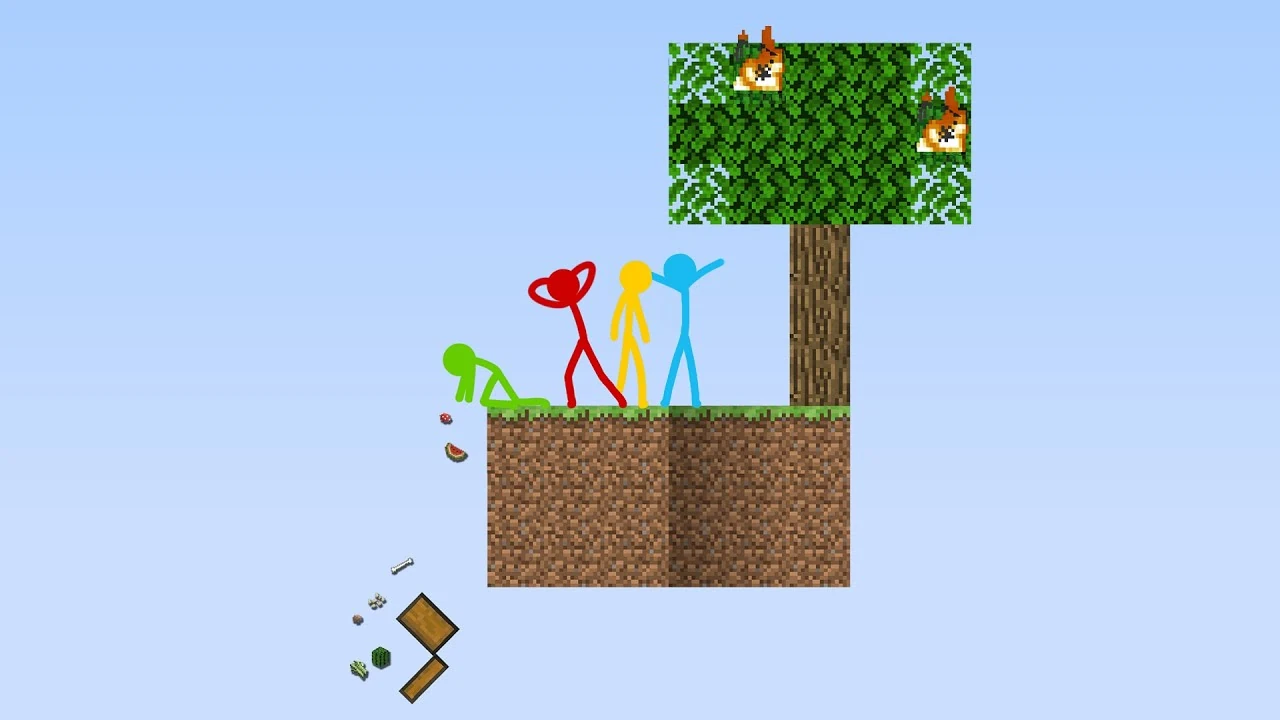 The episode begins with all five stick figures staring dumbfoundedly at the newly discovered Nether Portal Network. Yellow, Blue and Red immediately run off to investigate. Green joins them after saying goodbye to The Second Coming, who refused to come, thinking it was too dangerous. The four stick figures all run through the first portal, and are teleported above a SkyBlock made of four cubes of turf containing a tree and a chest. Blue and Yellow harvest the tree, while Green and Red investigate the chest. Green, irritated by Red's interferance, shoved him away, resulting in a minor fight that knocked the chest off the block. Blue and Yellow successfully harvest the tree, but the only sappling produced also falls off the block. Blue pulls out another sapling from his inventory and plants it, as the other stick figures decide to use their own resources to expand the SkyBlock. Back on the desktop, The Second Coming had recreated a relaxing beach front, complete with Beach Sounds playing in the background. Despite his newfound relaxation, The Second Coming quickly becomes lonely. A nearby photo of him with the other stick figures only amplifies his loneliness. The other stick figures are content on their developed SkyBlock. Green builds the finishing touches on Yellow's mob grinder, while Yellow collects mob loot and stores it in a chest. Blue is busy harvesting and crafting food, with resources from Red's pet cow and pig. Blue and Red eventually bring up some food for the four stick figures to begin a feast.