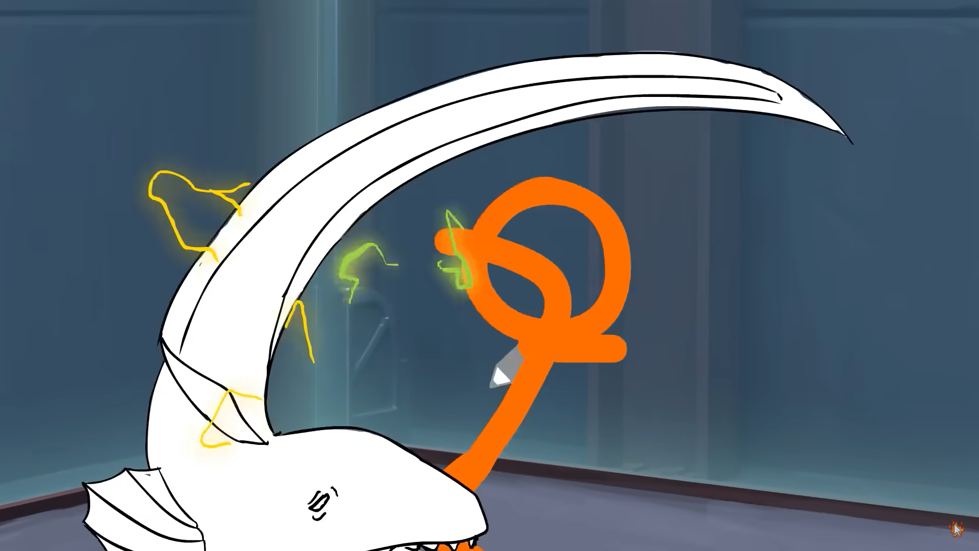 At the organization's headquarters, workers begin experimenting on the pencil icon. One of them places the pencil on a table inside an encased test area, inside which another worker is tasked with recreating TSC's drawings, as two others observe and document the process. The worker inside the test area draws a circle, but nothing happens. They try drawing more shapes, mimicking TSC's actions in an attempt to recreate the eel he made (seen in a recording of his combat against the mercenaries), but can do nothing more than draw a back-and-forth line in midair. Seeing their efforts fruitless, the observers decide to get TSC himself to use the pencil.