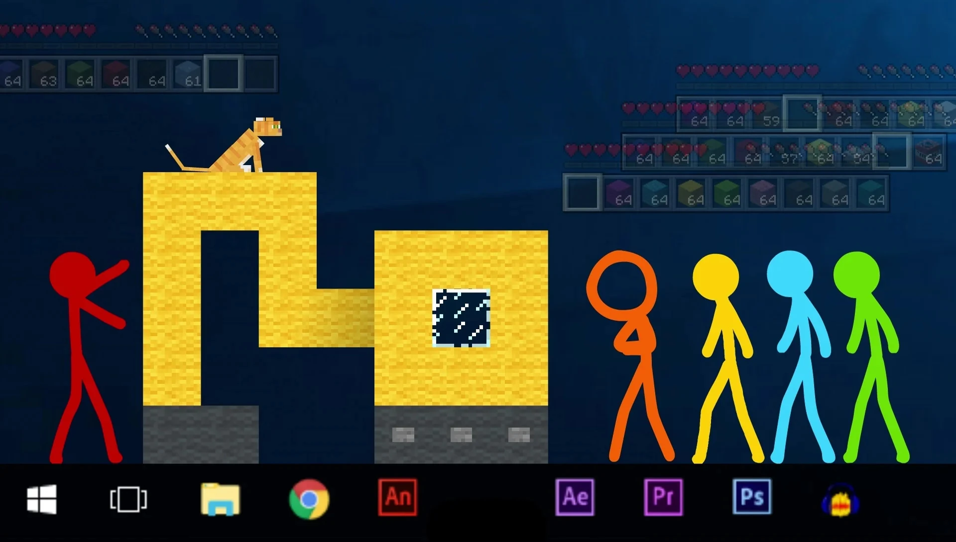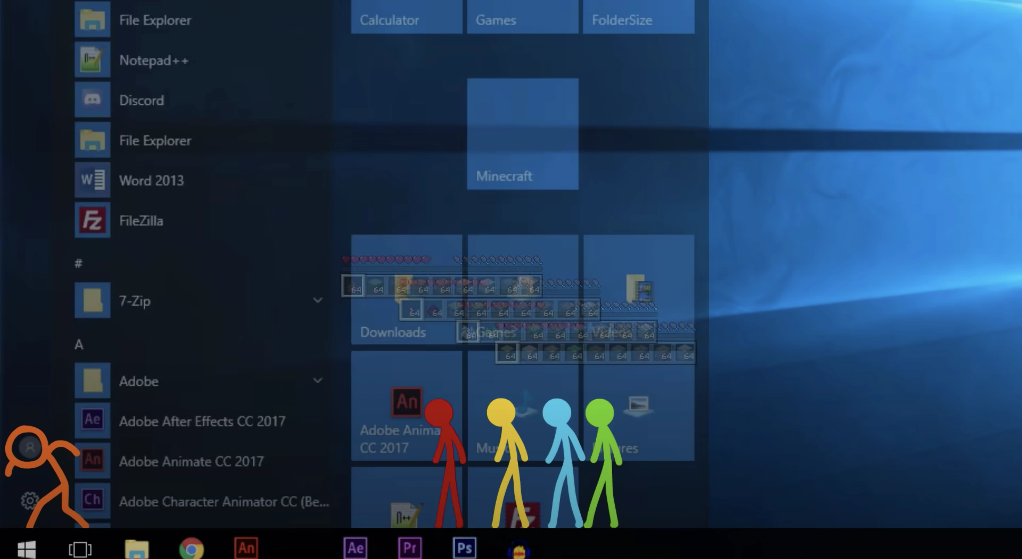 The episode begins with The Second Coming using the Minecraft Game Icon block to create four stacks of every item. The Fighting Stick Figures each take a stack of every item. The Second Coming then puts away Minecraft, and opens Google Chrome.