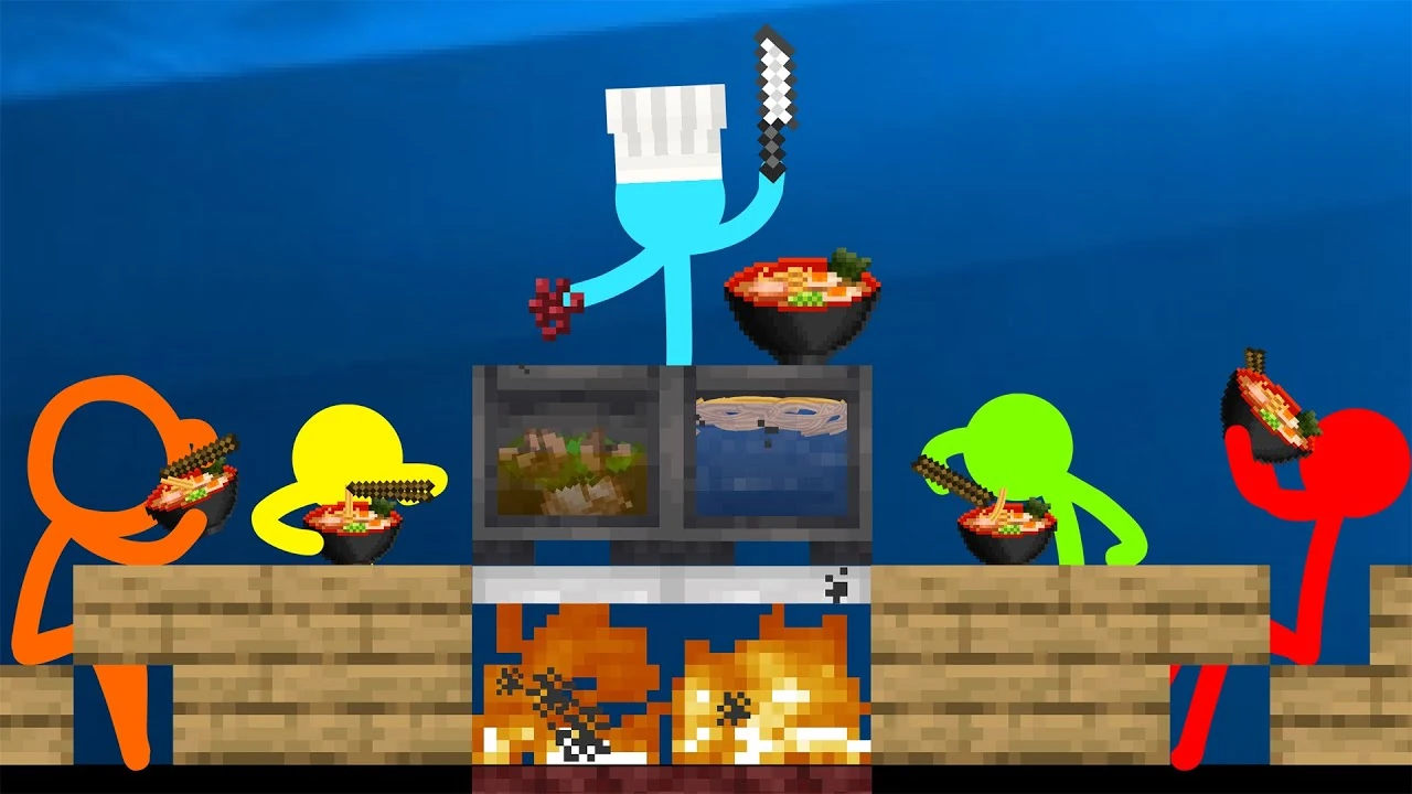 The Second Coming, Green, Yellow and Red sit at their table on Alan's PC hungry. While they express dissatisfaction at their vanilla Minecraft food, they hear Blue slurping down on a bowl of ramen, but refuses to share. Instead, Blue teaches them how to cook four bowls of ramen before serving. Green then takes out the recipe, asking where Blue got it, and Blue mentions that he got it from the Plains Village where he helped train the Villagers in the past.
