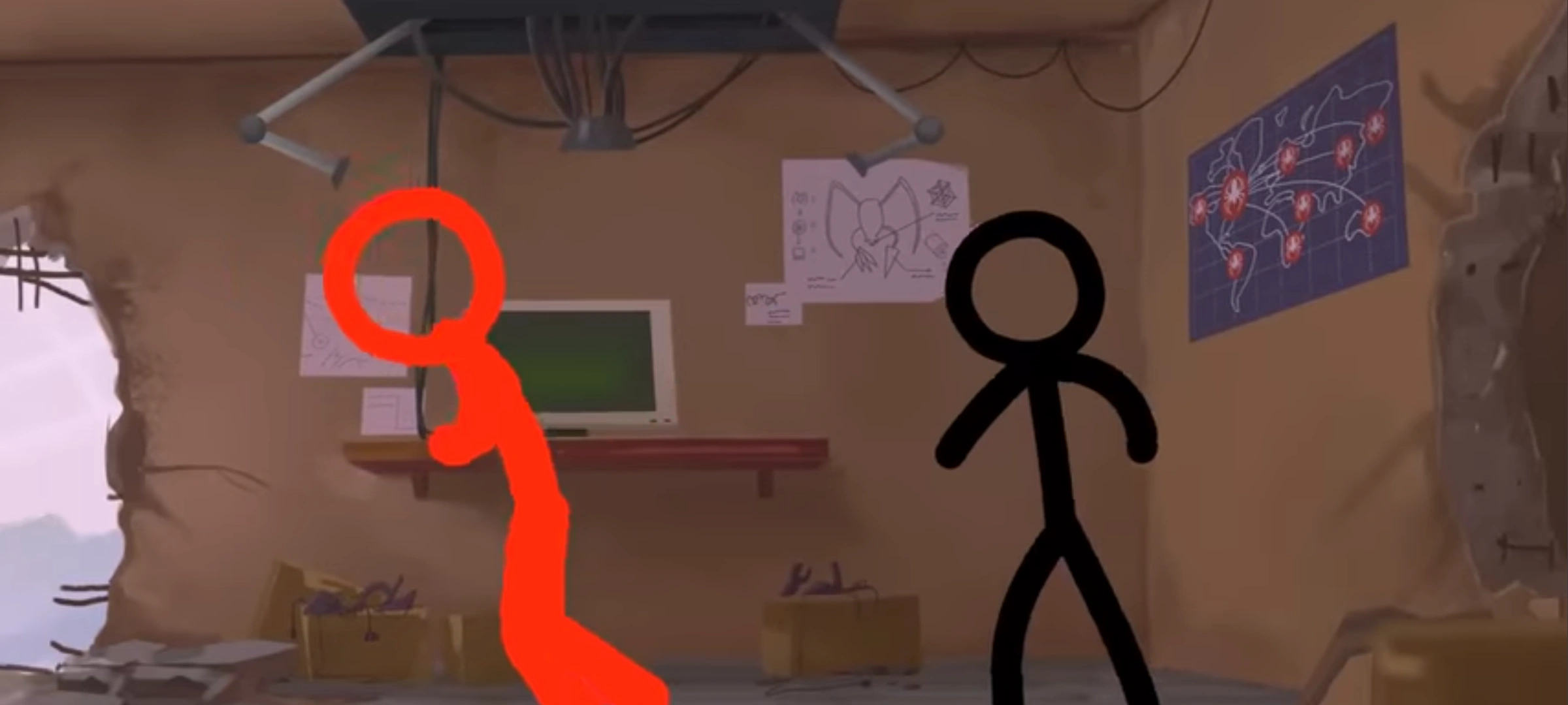 During their rampage on the Internet and Outernet, TCO and TDL appear to live here when they're not rampaging. TDL shows off his new ViraBot design to TCO, shocking TCO. Before TCO can deny TDL the chance to launch the ViraBot, TDL does it anyway, but TCO stops him before he can press the button. However, they both destroy large chunks of the building (and the ViraBot launcher, although not before TDL presses the button) in the process. TDL is launched away, and TCO is about to chase after the ViraBot's egg when he sees that the destination of the ViraBot is ALANSPC. However, remembering noogai3 as his creator (and father), he chases after the egg anyway.