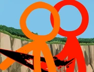 TDL, having knocked TCO into the water again, turns around and is shocked by the appearance of the cursor. Before he can react, he is grabbed and shoved into the cliffside. TCO enters the fray and he and noogai attack TDL. Pinning him against the cursor and trying to burn him alive, TDL grabs his opponent and activates a corrosive blade, thrusting it into his chest. TCO falls into the water and TDL attempts to kill him but is intervened by the cursor blocking his path. He is pulled upwards by the cursor, which disappears when it exits the Animator Combat Tool window. noogai right clicks and a Windows menu knocks TDL into the water, before he flies back up and stabs the mouse cursor. TCO flies up to help and the battle becomes a mess of flying rocks, lasers, blades, and corrosive orbs. TDL, angered at loss of the upper hand, clones his wristband onto his other hand and summons his army of ViraBots to help him. The swarm overwhelms the cursor, which is unable to react to the ViraBots. TCO tries to burn them and knock them away but is grabbed by TDL and violently thrown into the cliffside. TDL then stabs his corrosive blade into the cursor, which splits into four blades on the other side, and he and his ViraBots delete the cursor and crash the program, removing the cursor from the fight. With the cursor gone, TSC's friends panic, especially when they see him running out to help TCO. TDL shifts his focus to TCO, pinning him down. Just as TDL is about to charge in for an attack, TSC gets between them and tries to stop the fight. TDL, surprised, tells his ViraBots to move and ignites his left blade, seemingly with the intent to finish TSC himself, when the he is interrupted by the arrival of the Fighting Stick Figures.
