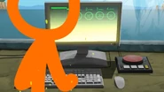 Elsewhere, the Stick Gang manages to climb out of the water and arrives near TDL's shack. Hearing a splash of water, they poke their heads over the cliff to see TCO and TDL fight. After a few seconds, they walk over to TDL's shack, with Red slamming open the door. Inside, while Yellow and Blue look down and see more inactive ViraBots, Red and Green look at a computer on a desk and see the portals on-screen are activated and linked to an unknown location. Red sees a black and red wristband and plays around with it. A slip leads him to accidentally pressing a button and opening the hatch doors. Meanwhile, TCO manages to grab TDL and attempts to laser him, but TDL pushes TCO's head upwards, causing the beam to harmlessly fire into the sky. Unaware of the open portals, their fight carries them in. They arrive in a YouTube video of The Showdown, with both fighters pausing and unpausing the video at certain moments to injure their adversary.