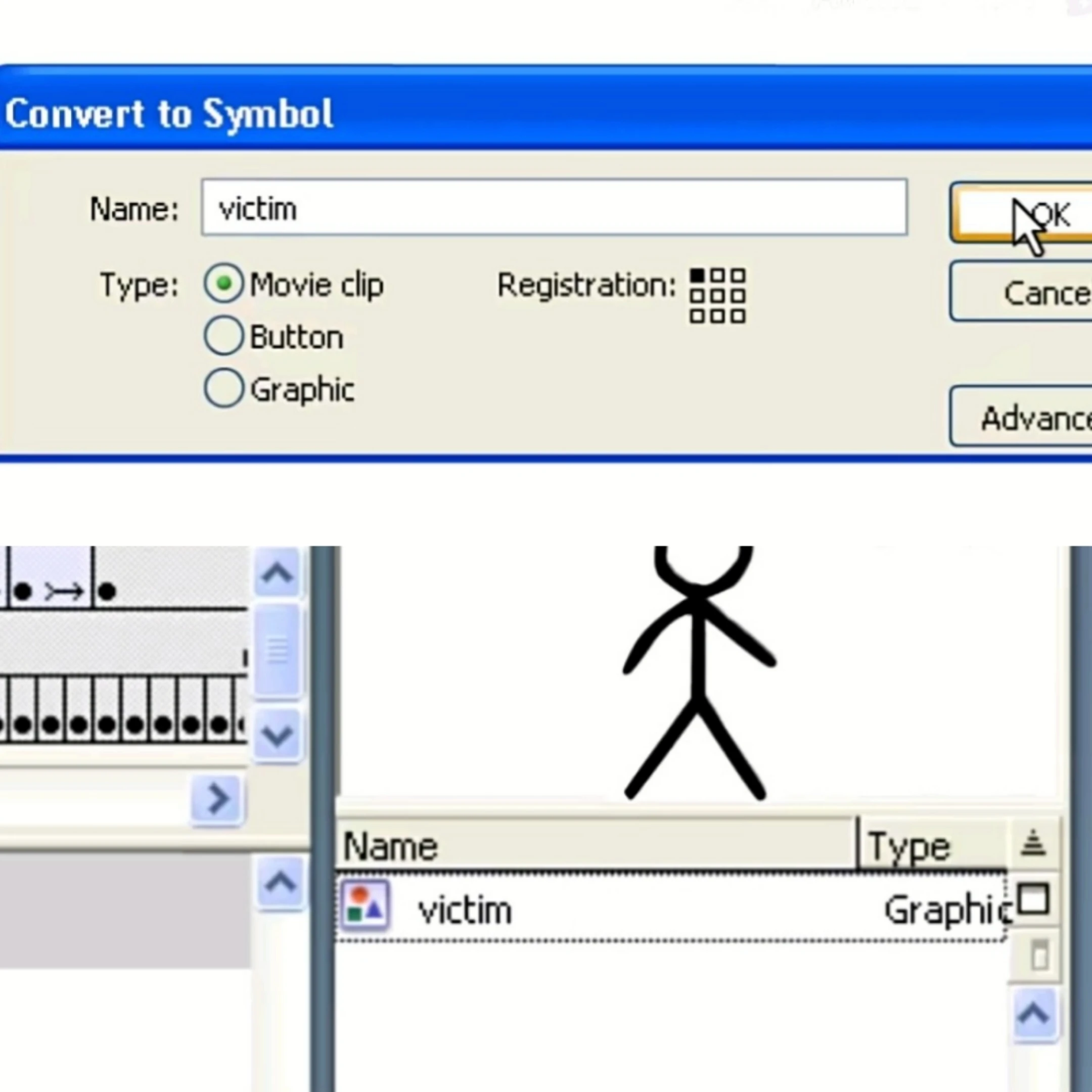 動畫師畫了一個黑色的火柴人,點擊他並選擇「轉換為元件」,將他命名為受害者。受害者環顧四周,想要逃離他的選擇框。動畫師畫了一個重物碾壓他,但只壓碎了火柴人推倒的框。受害者跳到光標上抓住不放,被帶到了工具窗格。動畫師選擇套索工具綁住受害者,但他用放大鏡工具拍飛光標後逃跑。